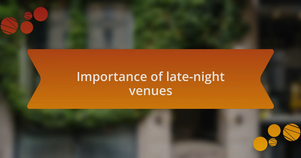 Late-night venues play a crucial role in fostering cultural vibrancy and social interaction. I distinctly remember a night spent chatting with friends over energizing tracks, where every laugh and dance moved us closer together. Isn’t it fascinating how music can break barriers and create connections among people who might never meet otherwise?